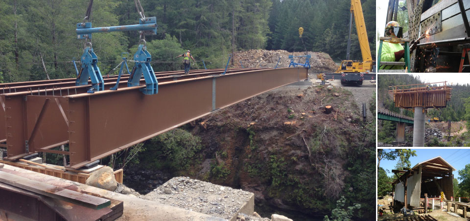 WCC met a tight project schedule in building two replacement bridges near Crescent City, Calif. The larger bridge across the Lower Smith River required the drilling of holes six feet in diameter and 40 feet down into hard rock to support two concrete piers, girders and a poured-in-place concrete deck. We built concrete abutments on the creek bank to support the deck of the smaller bridge, running across Hurdy Gurdy Creek about a mile upstream. Our project crews washed all equipment before moving it on-site or off-site and were required to wash stumps removed from the surrounding area to prevent the transfer of native plant life in the dirt to another location.