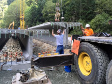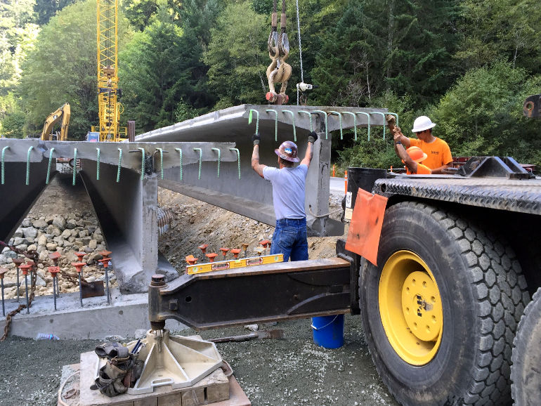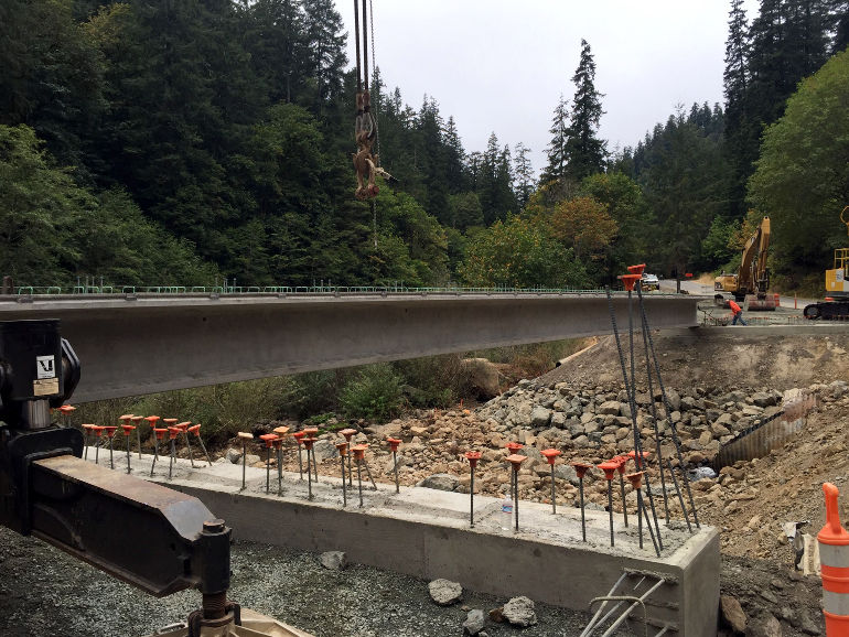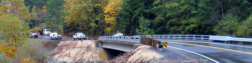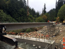 Coal Creek had been running through two culverts under the highway for several years. As culverts hinder native fish migrations, many are being replaced with bridges as repairs are needed. For this job, WCC needed to perform road realignment, set two concrete abutments, and mount five precast, prestressed concrete 5' high x 6.5' wide x 123' long girders. The abutments are set on 10-inch diameter steel piles for reinforcement. Paving, curbs and rails were added to complete the bridge. Additionally, WCC installed 1,500 cy of riprap on the stream bank and placed 100 large boulders in the stream bed to enhance fish passage.