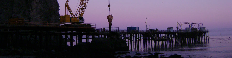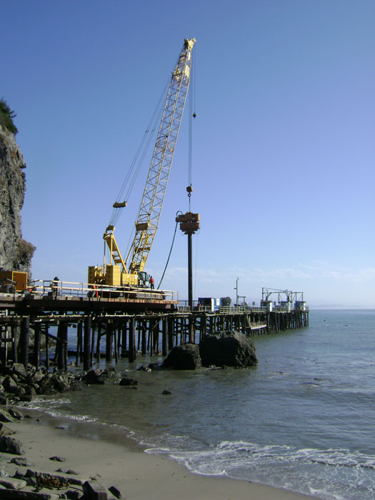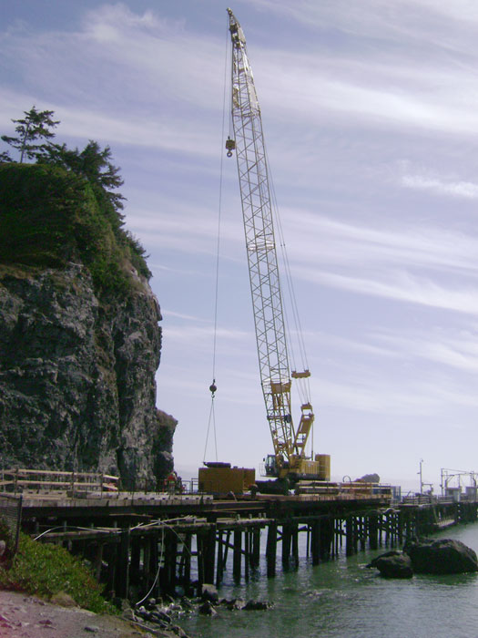 West Coast Contractors (WCC), in partnership with the Cher-Ae Heights Indian Community of the Trinidad Rancheria, rehabilitated the northern most oceanfront pier in California. This project included replacing the 540-foot-long pier's wooden deck structure with an impervious precast concrete deck that is properly sloped and drained. Replacing the pier's 24-foot to 26-foot wide wood deck with concrete involved the installation of steel piles along with moorage and fender piles. A pile bent was also installed at the existing elevation of the lower deck to provide access to the floating dock. To complete this project, large rocks located around supporting piling and under the dock were moved in order to place the piling. WCC utilized professional divers to assist moving the rocks with an excavator and crane mounted clamshell bucket.