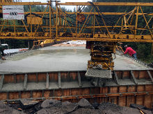 The two bridges utilize precast, prestressed concrete beams 150 feet long by 5.5 feet high. Bridge 4 is 210 feet long with the beams resting on 5 foot diameter columns which were drilled to a depth of 40 feet, 15 feet of which was drilled into solid rock. The forms were then filled with rebar and concrete to form the columns. On each end, 30 foot cast-in-place slabs rest on abutments utilizing driven piles. Bridge 5, at 150 feet, rests on similar abutments at either end.